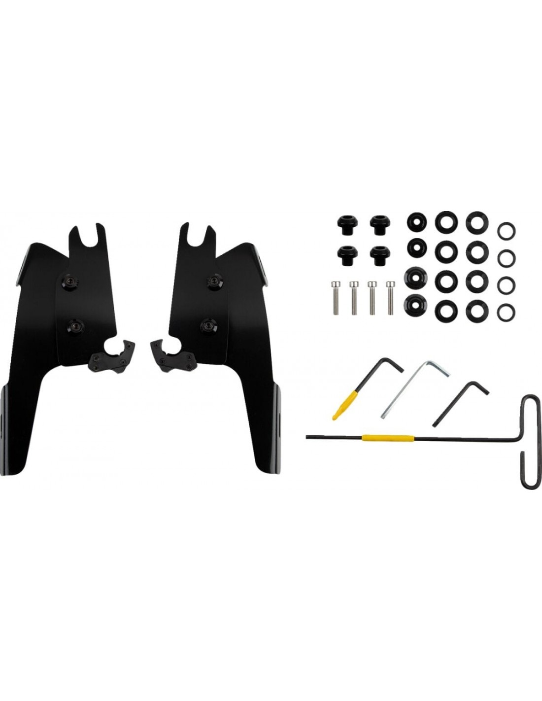 Memphis Shades MetricKit di montaggio con grilletto per carenatura batwingangolo regolabile installazione semplice e specifica per il modello, quindi on-off senza attrezzi un paio di i fermi in nylon riempiti di vetro lo bloccano fino a quando i "trigger-lock" caricati a molla non vengono intenzionalmente disinnestati realizzati esclusivamente in alluminio elettrolitico e acciaio inossidabile, con elementi di fissaggio in acciaio inossidabile l'hardware di ancoraggio è lo stesso per tutti i parabrezza e le carenature di ogni moto prodotto negli usa - prodotto a memphis richiede il blocco di estensione del faro n. 2001-2631 Per la carenatura batwing/richiede il ritaglio hedlight da 9" per memphis fats/slim