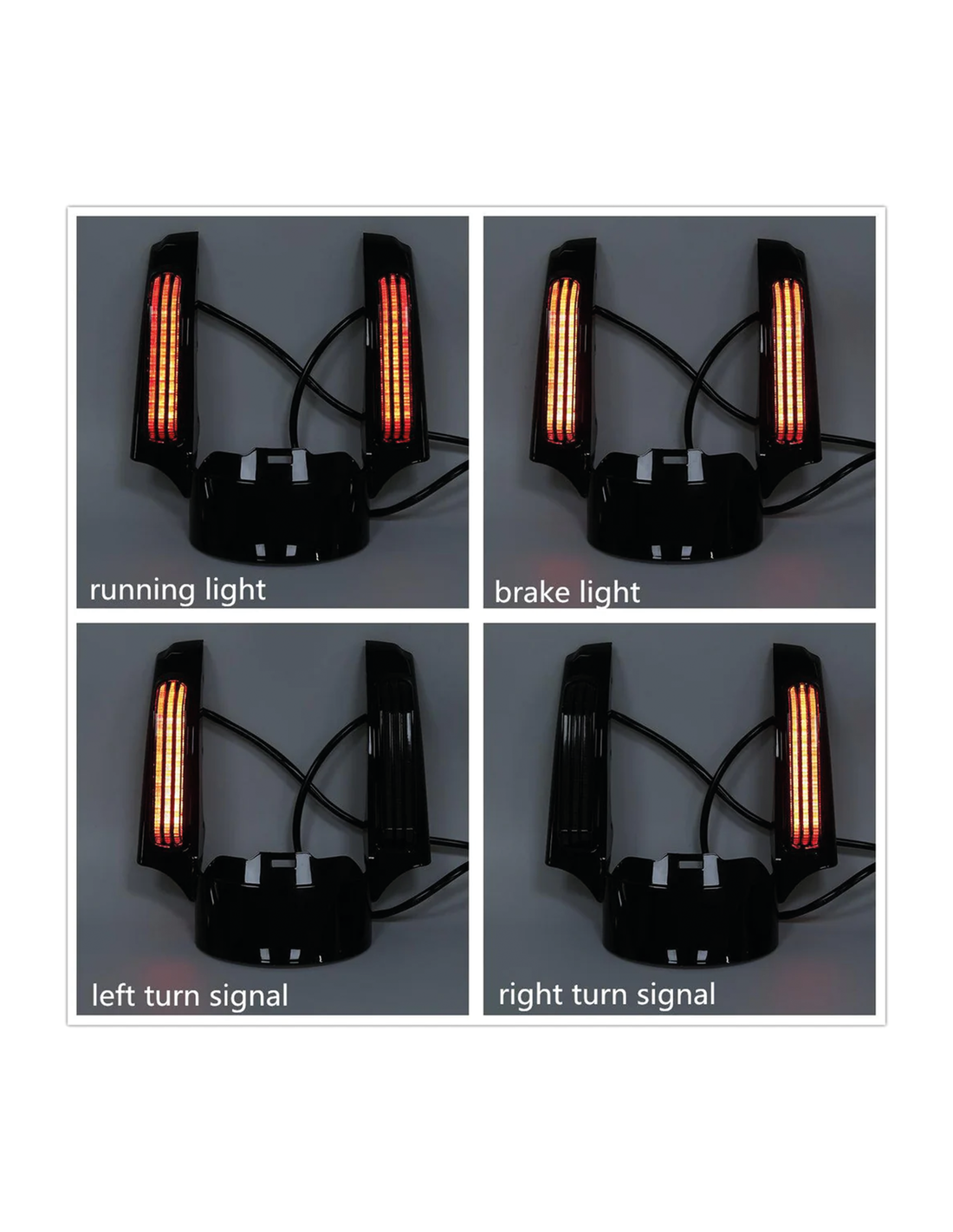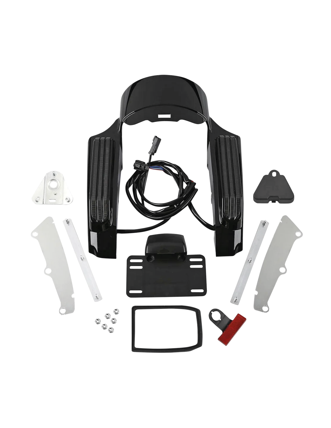 i pannelli in ABS verniciati neri o aspetto carbonio si fissano al parafango posteriore di serie e chiudono lo spazio tra il parafango e le borse laterali. Presenta lenti fumé con led rossi di tipo americano per le funzioni di luce di marcia, luce del freno, indicatori di direzione e luce posteriore. Viene fornito precablato e include la staffa per la targa e il riflettore posteriore. Si noti che l'illuminazione non reca alcun marchio di omologazione.