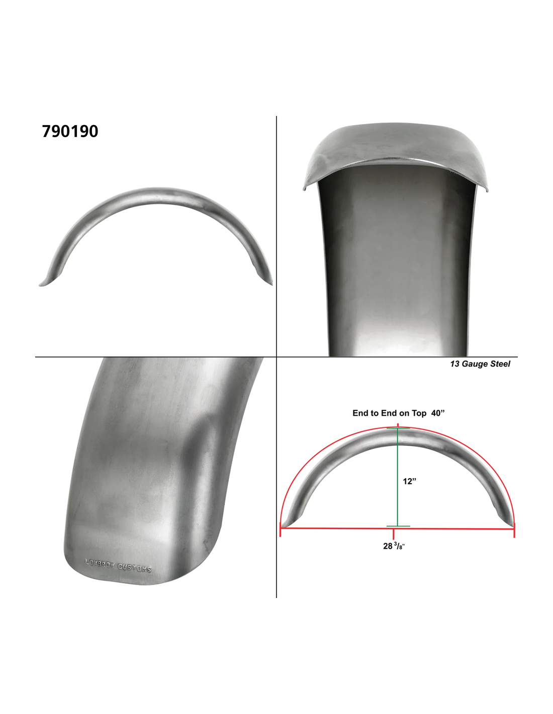 Lowbrow CustomsI parafanghi posteriori universali in acciaio da 13 gauge (2,3mm) per l'uso con ruote da 16"-18" in telai rigidi offrono una copertura della ruota di 180 gradi. Può essere utilizzato anche in applicazioni con forcellone quando il parafango è installato in modo tale da muoversi insieme alla ruota.