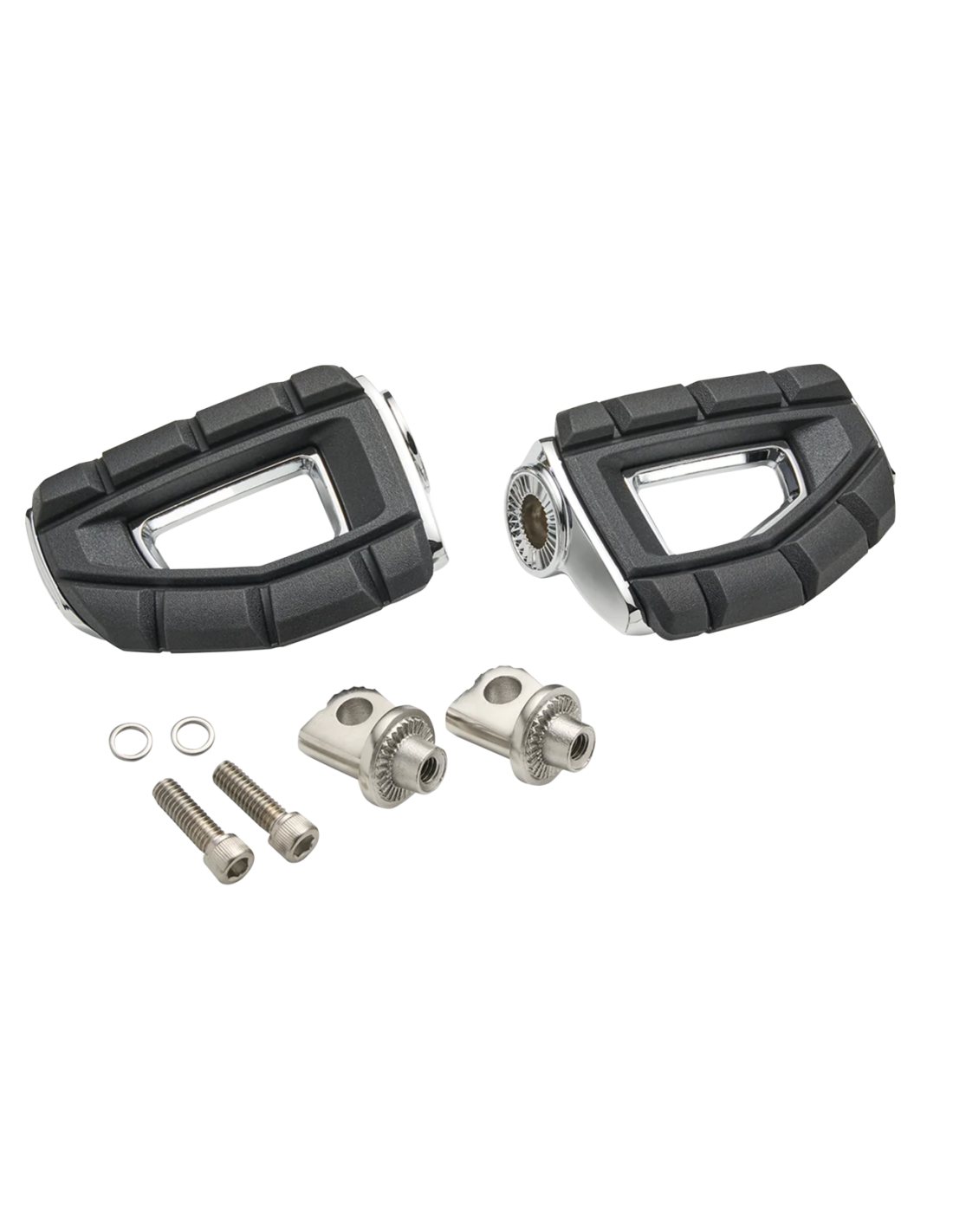 Ciro 3DI poggiapiedi Chicane sono il componente essenziale per il comfort del piede. I resistenti inserti in gomma EPDM afferrano il piede e smorzano le vibrazioni. Con un labbro laterale che mitiga lo "scivolamento", lo stile e le prestazioni di queste pedane cambiano il comfort del pilota. Le pedane sono dotate di supporti maschi rotanti bloccabili a 360 gradi per le applicazioni Harley standard. Per altre applicazioni, è necessario ordinare separatamente un set di adattatori adatti.