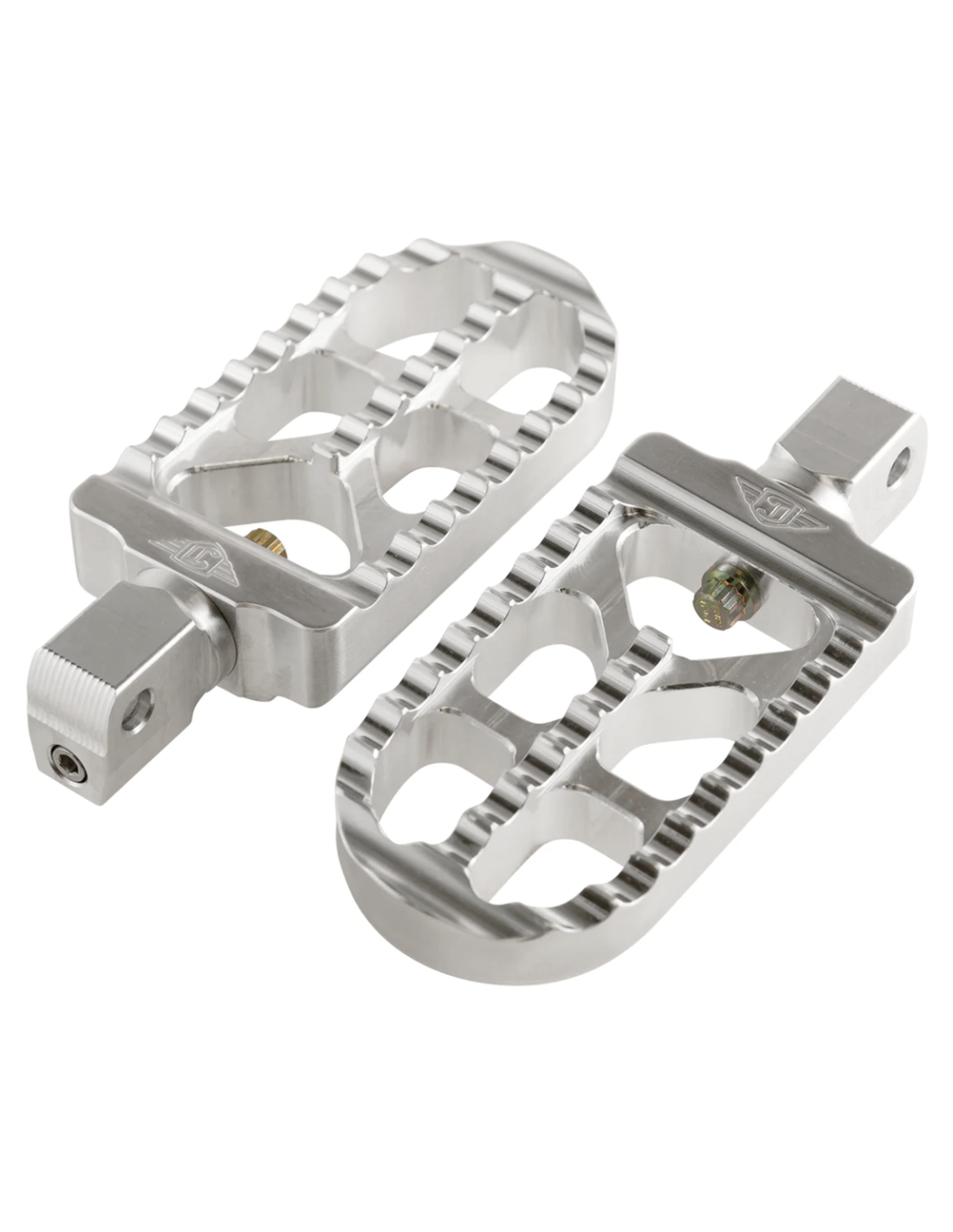Joker MachineQueste pedane sono lavorate a CNC da barra 6061-T6. Si tratta di una struttura in 2 pezzi, resistente ma leggera, che offre una superficie del piede più ampia per una guida confortevole. La superficie dentellata offre una buona aderenza. La rotazione completa a 360 gradi li rende perfetti per qualsiasi applicazione. La vite di regolazione del passo li mantiene sempre in una buona posizione di guida. Queste pedane sono vendute in coppia e si adattano a tutte le Indian Scout 2015 a oggi e tutte Victory Octane 2017.