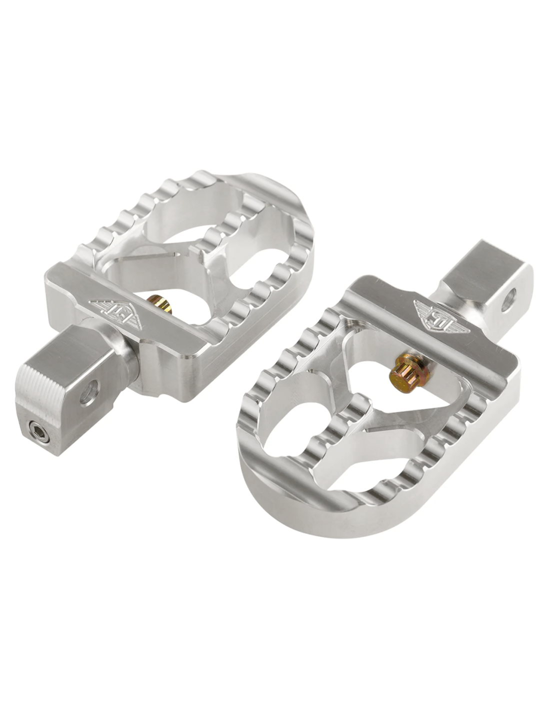 Joker MachineQueste pedane sono lavorate a CNC da barra 6061-T6. Si tratta di una struttura in 2 pezzi, resistente ma leggera, che offre una superficie del piede più ampia per una guida confortevole. La superficie dentellata offre una buona aderenza. La rotazione completa a 360 gradi li rende perfetti per qualsiasi applicazione. La vite di regolazione del passo li mantiene sempre in una buona posizione di guida. Queste pedane sono vendute in coppia e si adattano a tutte le Indian Scout 2015 a oggi e tutte Victory Octane 2017.