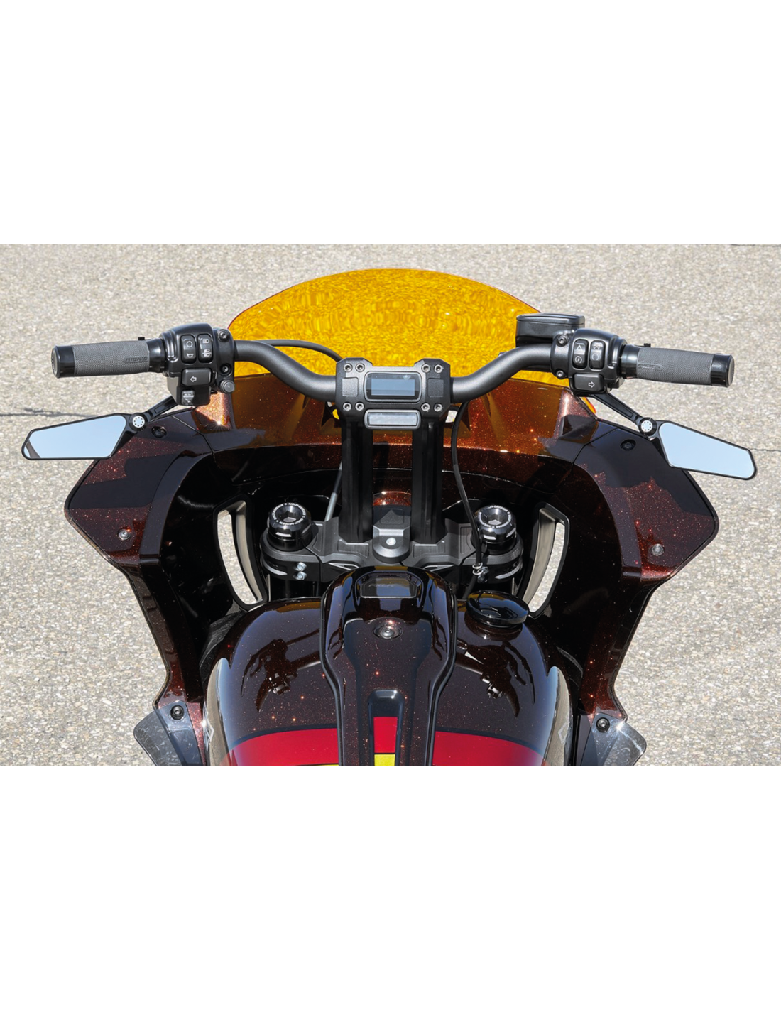 Rick's MotorcyclesLa piastra superiore della forcella in alluminio billet anodizzato nero consente l'installazione di tubi della forcella di serie e 10 mm più lunghi e accetta i riser OEM o Rick's Clubstyle. Viene fornito completo di ferramenta per il montaggio e di una copertura per l'attacco del faro sui modelli Low Rider S.
