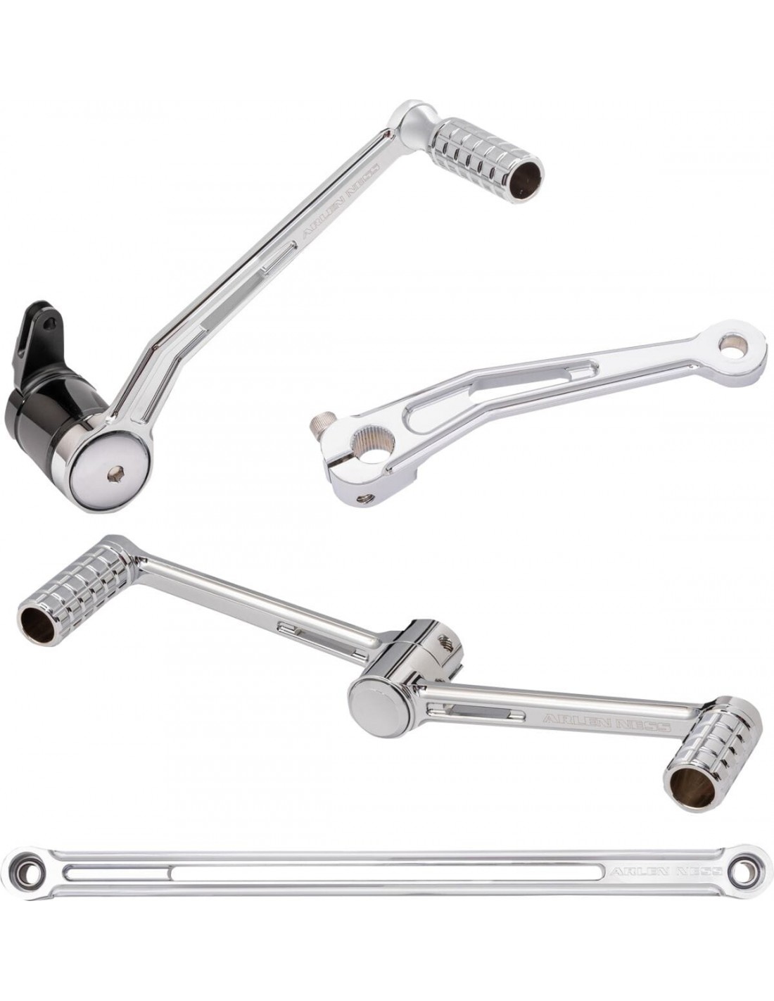 Kit comando a pedale speedlineril design ricavato dal pieno zigrinato 3d migliora drasticamente lo stile del comando a pedale aggiungendo trazione costruzione in alluminio billet lavorato a cnc il kit include il freno braccio, asta del cambio, braccio del cambio interno e amp; sia un cambio singolo che tallone/punta con picchetti l'asta del cambio è dotata di cuscinetti sferici appositamente progettati per un look ultra pulito, eliminando la necessità di giunti a snodo ' i modelli dal 00 al '07 richiedono l'adattatore per il braccio del freno 1610-0632 (venduto separatamente).
