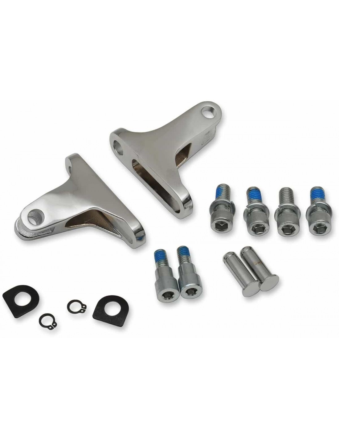 Kit attacchi poggiapiedi passeggero cortoGli attacchi sono di 2-1/2" di lunghezza Spostano i poggiapiedi passeggero avvicinandoli alla moto per un look più elegante Compatibili con la maggior parte dei poggiapiedi con attacco maschio (venduti separatamente) Materiale per il montaggio e perni mobili inclusi