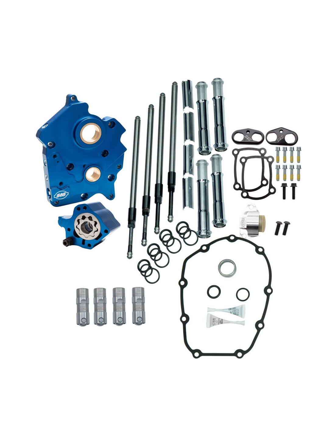 S&S CycleKit completo che include pompa dell'olio, piastra camme, aste Quickee, coperture aste nere o cromate, punterie Premium, collari punterie in alluminio anodizzato indurito, albero a camme performante, guarnizioni, cuscinetti e tutto il necessario per l'installazione. Il kit per la guida ad ingranaggio include anche tutto il necessario per la conversione eliminando i tendicatena di serie. La camma 465 aumenta la coppia ed è adatta soprattutto ai Touring. La camma 475 a montaggio diretto da una bellezza di 100bhp. I kit con le camme 540 sono progettate per i kit Big Bore 124CI o 128CI e kit molle valvole ad alta alzata. Il kit senza albero a camme è disponibile quando si desidera combinare tutti i vantaggi di questi kit S&S con un albero a camme Andrews, Star Racing, Zippers Red Shift o di altra marca.Disponibile per tutti i Touring e Trike Milwaukee Eight 107, 114 e 117CI dal 2017 a oggi e i Softail Milwaukee Eight 107, 114 e 117CI dal 2018 a oggi.