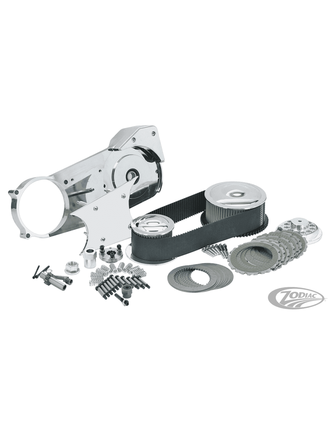 Zodiac (Genuine Zodiac Products)Un kit completo di primaria da 3" che contiene la cinghia, frizione completa, pulegge anteriore e posteriore, paracinghia laterale, piastre motore in alluminio billet, alloggio pignone ed ingranaggio avviamento. Ci sono molte primarie da 3" sul mercato attuale, alcuni più completi di questa ma nessuna con lo stesso rapporto qualità/prezzo. Per coloro che lo richiedono è disponibile un supporto esterno che deve essere ordinato separatamente. Un'altra opzione è la "Auto Clutch", una frizione semiautomatica impostata. Quando installi questa frizione automatica, puoi semplicemente innestare la marcia, tirare il freno e rilasciare la frizione. Quindi puoi anche rilasciare la leva del freno anteriore, ma al minimo la tua moto non si muoverà ancora. Non appena giri il motore sale di giri, la frizione si innesta e la motoi inizia a muoversi. Quando si preme il freno nel traffico intenso, è possibile lasciare la marcia inserita senza disinnestare la frizione. Basta aprire l'acceleratore e ripartire.
