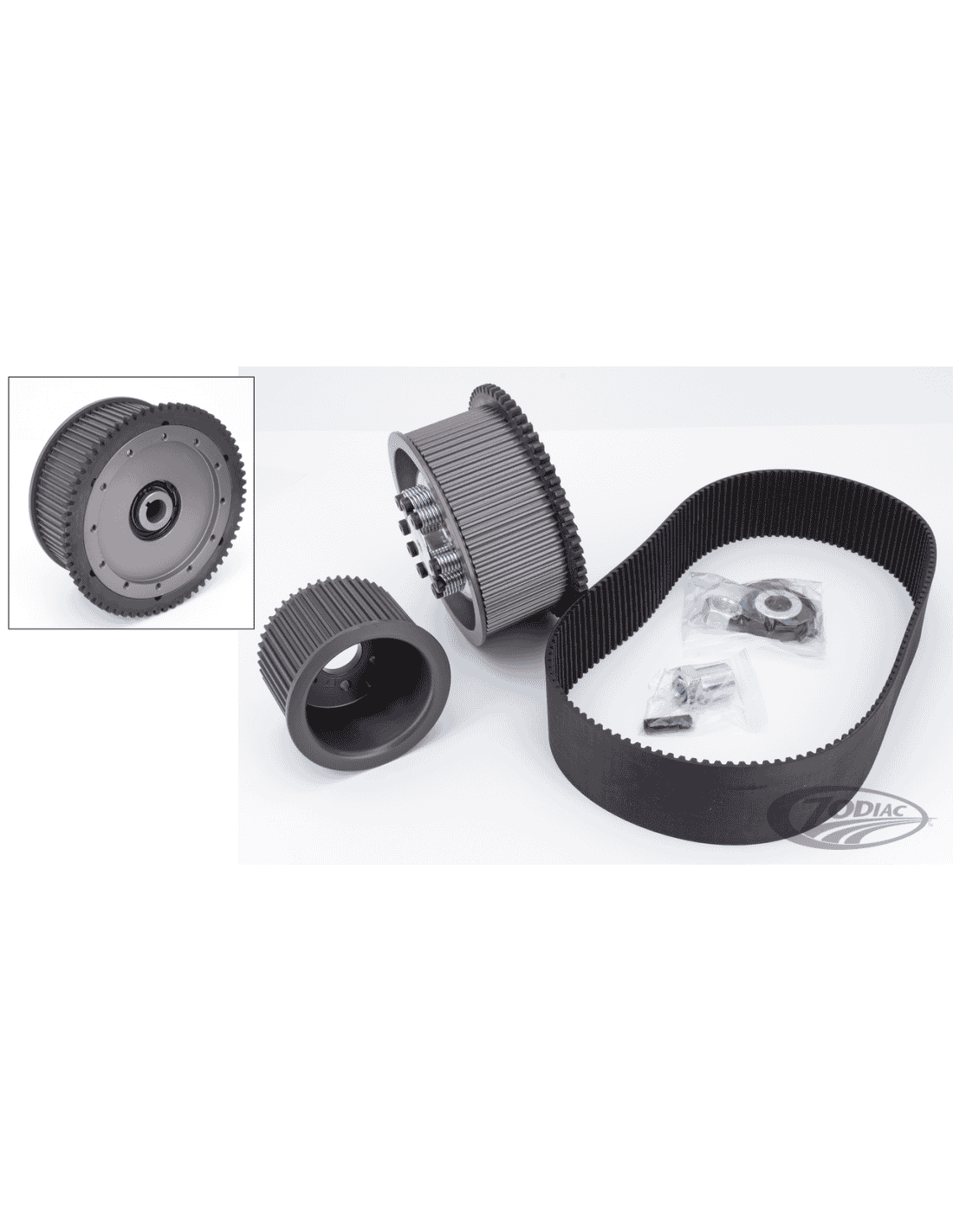 Belt Drives LTDI kit BDL non hanno lo sbilanciamento giroscopico e l'oscillazione della cinghia tipica di altri kit da 3". BDL ha montato il mozzo interno, un pollice più internamente che nella maggior parte delle altre primarie a cinghia. Con la puleggia posteriore montato più internamente sull'albero principale, praticamente tutta l'instabilità nella trasmissione primaria è eliminata. Il kit include pulegge con passo da 8mm con alloggiamento per frizione BDL, tutti i componenti per il montaggio, ed una nuova frizione BDL.