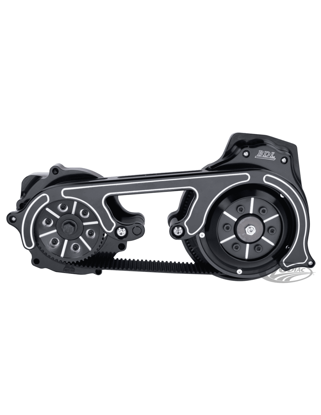 Questo kit primaria a cinghia è fornito con la cinghia BDL da 2" rinforzata che è stata sviluppata per gestire la maggiore coppia e potenza dei V-Twin attuali. In aggiunta il sistema incorpora una piastra di fondo in alluminio billet in un pezzo unico, una copertura frontale e posteriore e l'alloggiamento del motore d'avviamento tipico di BDL. Hanno anche una protezione nera tra la piastra del motore e la copertura esterna. Ogni kit include la nuova frizione brevettata da BDL con cuscinetti a sfera Questa la tecnologia aumenta la superficie di contatto del 30%, riduce la corsa della leva e produce un innesto della frizione senza difetti.