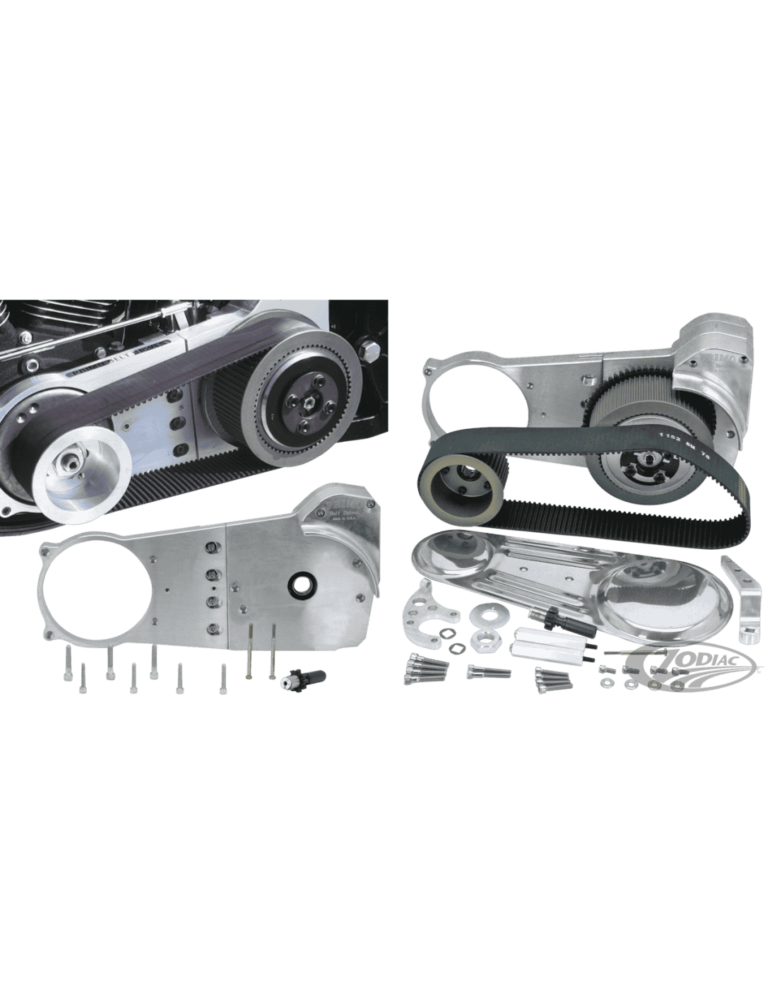 Rivera PrimoQuesti kit di trasmissione a cinghia surclassano tutti gli altri per lavorazione, adattabilità, finitura e prestazioni. I kit Primo contengono puleggia anteriore e posteriore, cinghia da 2" o 3", e kit frizione Pro-clutch completo con molla a diaframma. I kit completi includono inoltre una piastra di supporto in alluminio collega il motore al cambio, copricinghia e un supporto cuscinetto con cuscinetto installato. I kit per i modelli con avviamento elettrico includono anche l'alloggiamento per il motore di avviamento e l'estensione per l'albero dell'avviamento nonché, tutta la bulloneria necessaria. L'installazione del kit ZPN720504 nei modelli Shovelhead a 4 marce richiede l'acquisto separato di un motore d'avviamento dal 1989 al 1993 o dal 1994 al 2006. Per i costruttori sono disponibili inserti puleggia e dadi disassati, sono elencati nelle parti di ricambio .