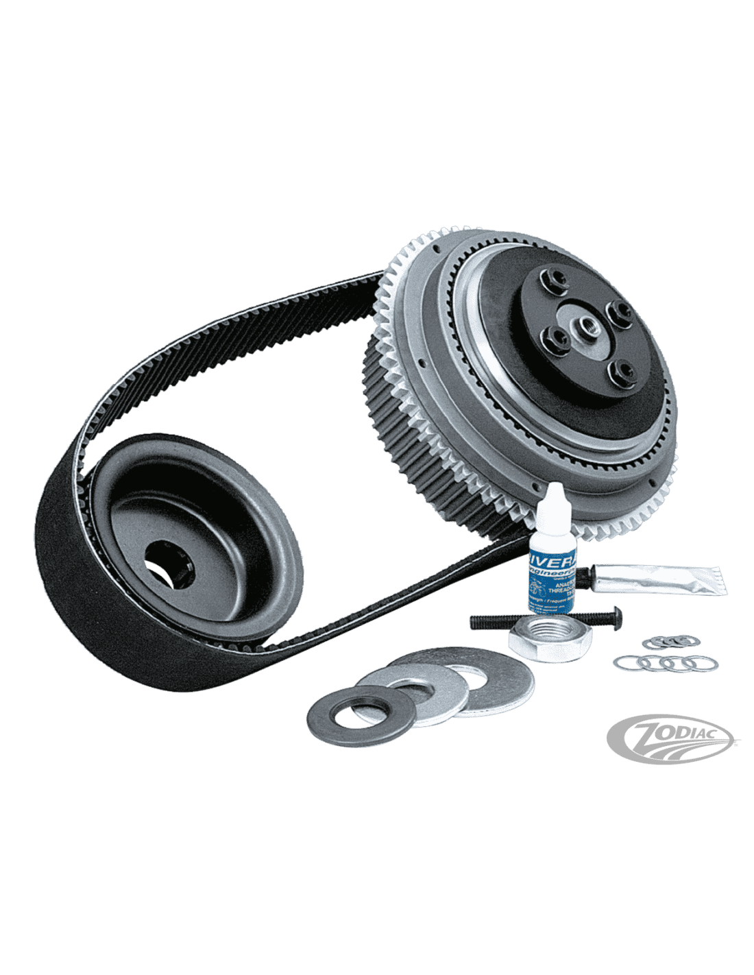 Rivera PrimoQuesti kit hanno una nuova combinazione di puleggia anteriore e posteriore che rende inutile l'uso del tendicinghia. Ciò non riduce il prezzo e non semplifica l'installazione. Il kit comprende puleggia anteriore, cinghia rinforzata da 1 3/4" e gruppo puleggia/frizione completo con piatto spingidischi, nonché tutta la bulloneria necessaria.