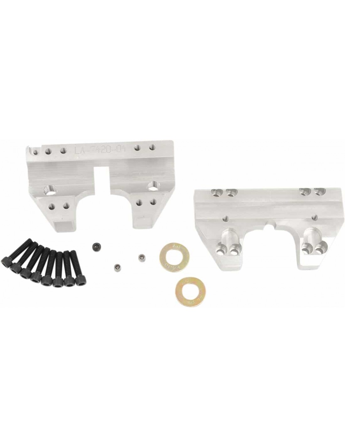 La ChoppersSet attacchi manubrioSi infilano al di sotto della cover originale Tutto il materiale necessario per l'installazione è incluso Lavorazione a CNC in alluminio 6061-T6 con finitura grezza Filettati per viti riser di 1/2”-13 La cover superiore presenta fori filettati per bloccare i manubri in posizione Dotati di dadi Made in USA