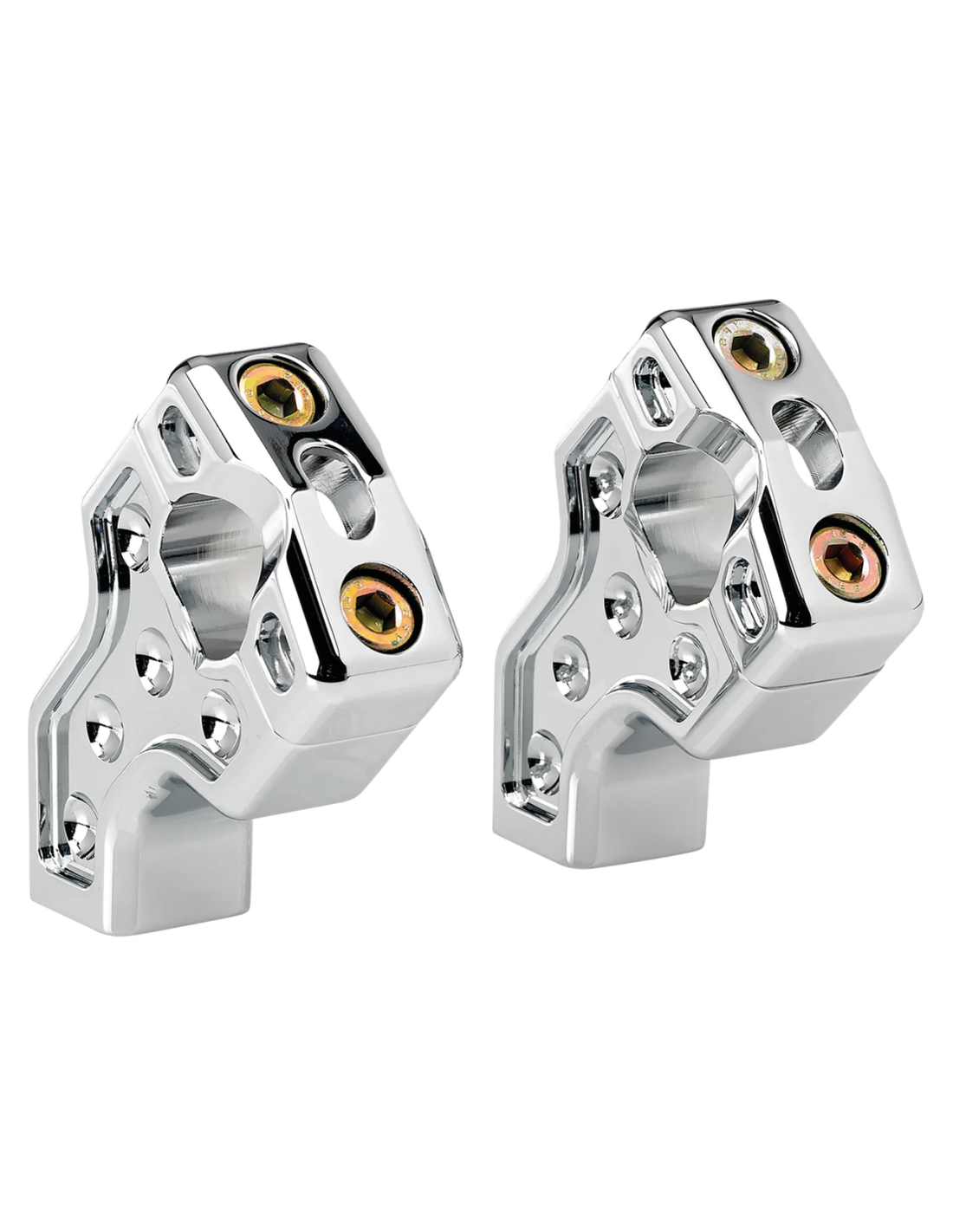 Joker MachineQuesti riser offrono un arretramento di 1 1/2" (3,8cm) con un altezza di 2 1/2" (6,4cm) e sono realizzati per manubri da 1". Si adattano alla piastra forcella superore di serie Harley-Davidson con fori di centratura da 3 1/2" (8,9cm). Sono filettati da 1/2-13" UNC e sono lavorati a controllo numerico da una barra 6061-T6 per la massima resistenza.