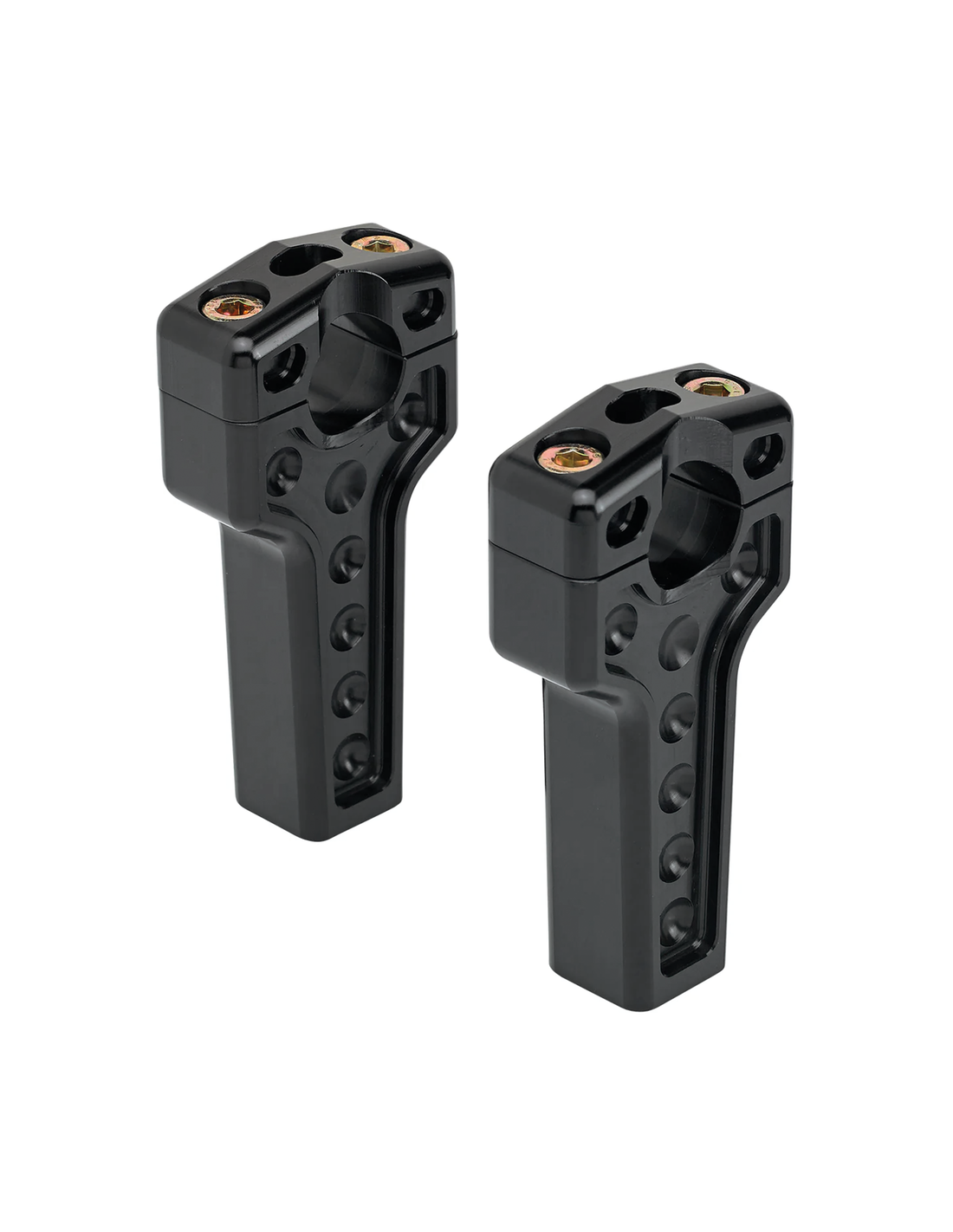 Questi riser sono realizzati per manubri da 1". Si adattano alla piastra forcella superiore Harley-Davidson con fori di centratura da 3 1/2" (8,9cm). Sono filettati da 1/2-13" UNC e sono lavorati a controllo numerico da una barra 6061-T6 per la massima resistenza.