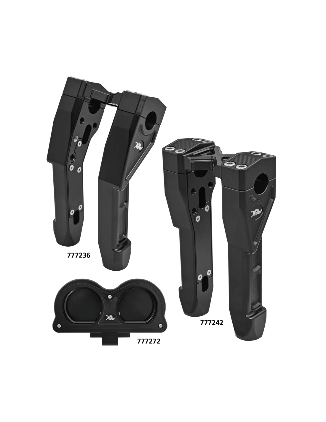 Ken's FactoryQuesti riser in alluminio billet con finitura anodizzata nera portano le linee rette dalla parte inferiore della forcella al morsetto superiore della piastra e, per alcuni di voi, alla parte superiore del manubrio. Per coloro che scelgono il kit di rilocazione degli strumenti Next Level, Ken ha lasciato dei punti di montaggio a disposizione, in modo che tutto sia ben saldo al suo posto. I riser sono dotati di un morsetto superiore monoblocco con design a "X" che rafforza la sensazione di sicurezza e resistenza.