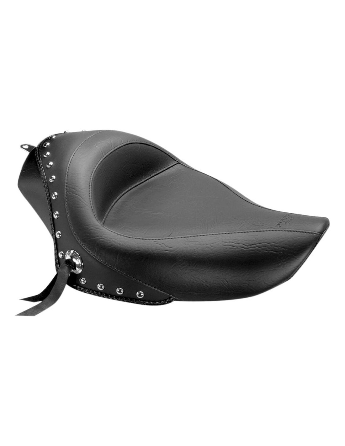 MustangSella singola in vinile con borchiecostruita su una base in acciaio con inserti di supporto per sostenere la sella spugnata per l'intera larghezza lo stile borchiato è rifinito con un bordo intrecciato e concho legati alla pelle rivestimento superiore in vinile espanso di altissima qualità sella passeggero coordinata, venduta separatamente made in usa
