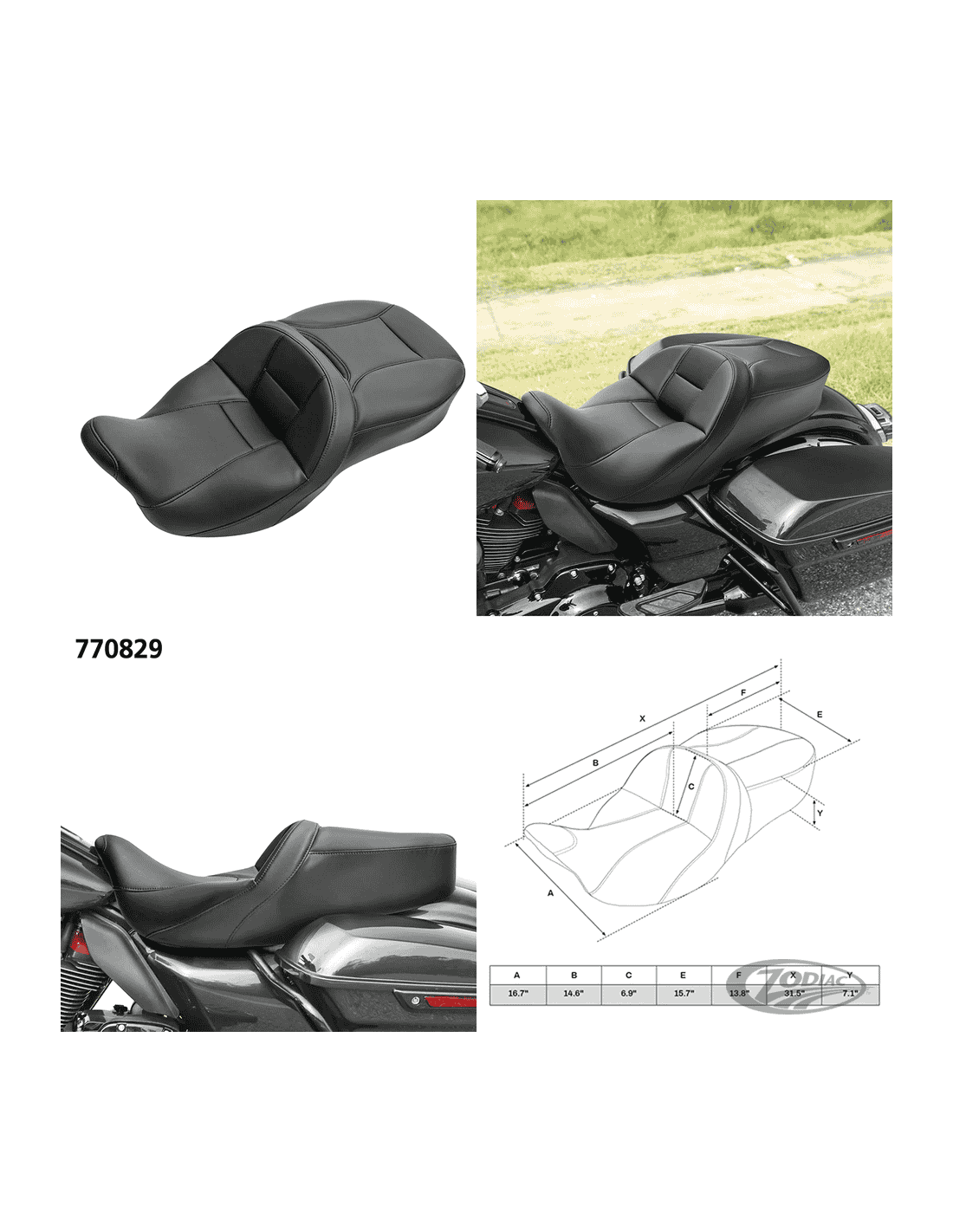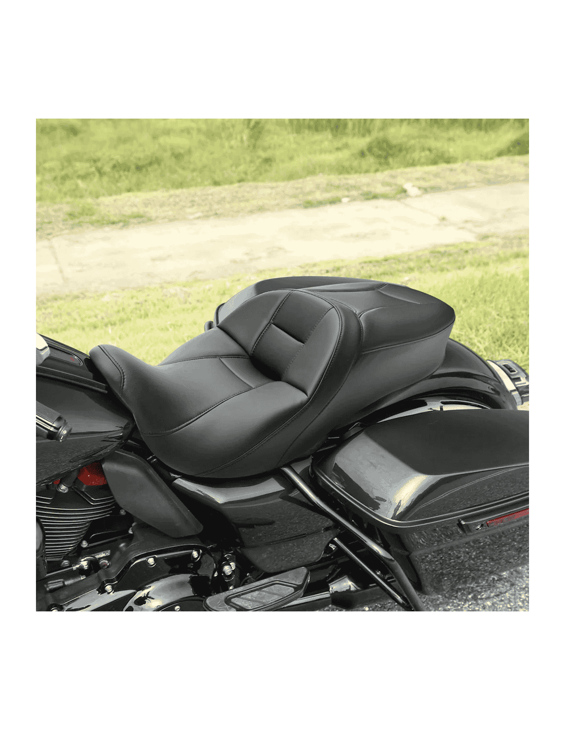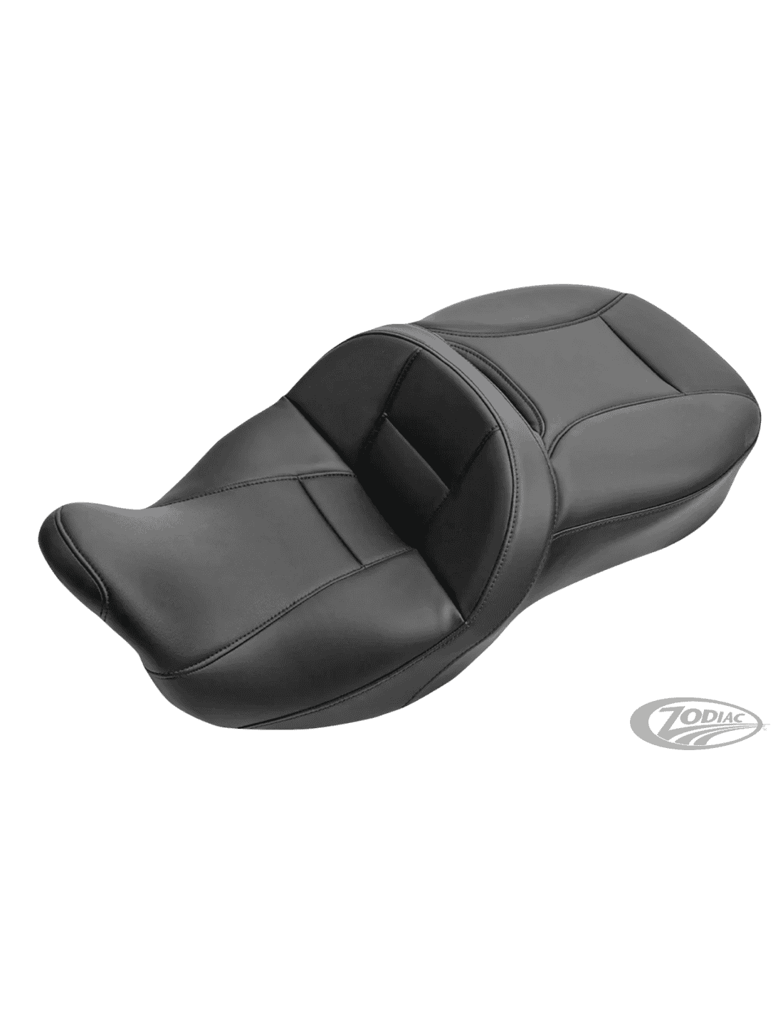 C.C. RiderSella 2-Up a bacino profondo con design a gradini. La sella in stile Hammock fornisce supporto alla schiena del pilota e lo aiuta a stare seduto in posizione ea ridurre l'impatto delle condizioni stradali difficili, offrendo protezione alla schiena sia del pilota che del passeggero. Realizzata in microfibra di alta qualità, offre durata e flessibilità. L'esclusiva schiuma offre un maggiore isolamento sia per il pilota che per il passeggero. Il sedile è predisposto per accogliere lo schienale del conducente, è lungo 31,5", l'area del conducente è larga 16,5", l'area del passeggero è larga 15,4".