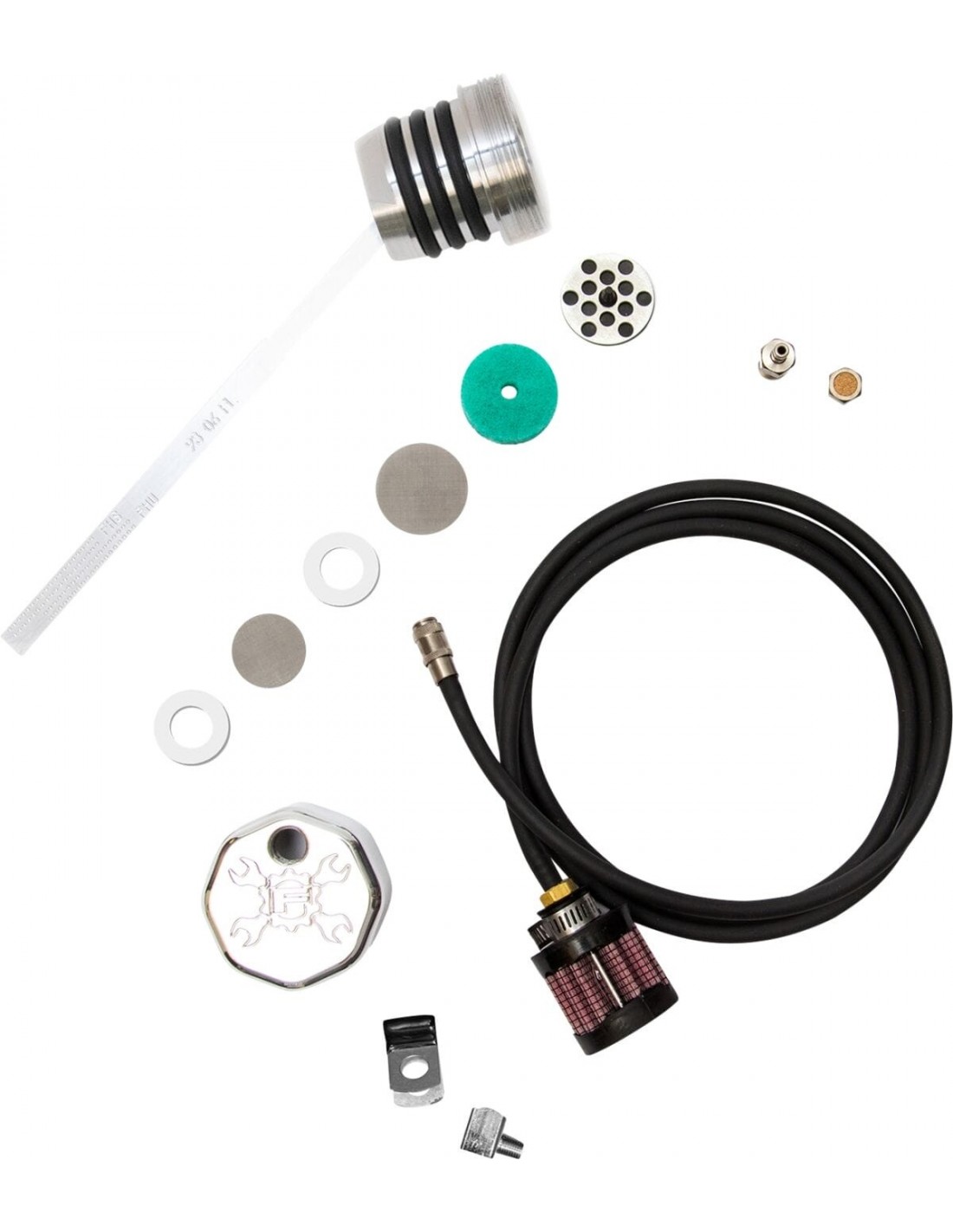 Feuling Oil Pump Corp.Astina di livello ventilatale aste di livello ricavate dal pieno sfiatano/respirano l'eccessiva pressione del carter dal serbatoio dell'olio attraverso uno sfiato in stile pcv, costituito da un sistema di separatore dell'olio, disco forato, elemento filtrante sostituibile e valvola a cerniera a ombrello include due diverse opzioni di stile di sfiato per l'installazione dell'astina di livello: opzione 1 - raccordo di sfiato con sfiato 1/8 npt con elemento filtrante poroso interno, opzione 2 - raccordo con accoppiamento rapido con tubo in gomma ed elemento filtrante ci sono due modi per leggere il livello dell'olio con questa astina di livello, con la bici sul jiffy stand (fhs) full hot stand o con la bici in posizione verticale e livellata (fhu) full hot upright l'olio la porta di raccolta si trova sul lato destro del motore. Lasciare la moto al minimo o riscaldarsi sul cavalletto riempirà naturalmente il carter del motore e distorcerà il livello dell'olio nel serbatoio. i risultati dei test di rifornimento mostrano una diminuzione dei livelli della coppa dell'olio motore, un motore che gira più liberamente/più agevolmente e aumento del mpg e diminuzione del trafilamento il trafilamento è la pressione che viene forzata oltre gli anelli e i cilindri, spinta nel basamento e quindi forzata nel serbatoio dell'olio è importante ottenere la temperatura corretta livello dell'olio nella tua bici. Feuling consiglia di mantenere il livello dell'olio al 90%-99% quando è caldo rimuove l'accumulo indesiderato di pressione nel serbatoio dell'olio si avvita nel beccuccio di riempimento dell'olio di fabbrica come pezzo di ricambio originale prodotto negli usa questa astina si surriscalda, usa un guanto quando controlli il livello dell'olio