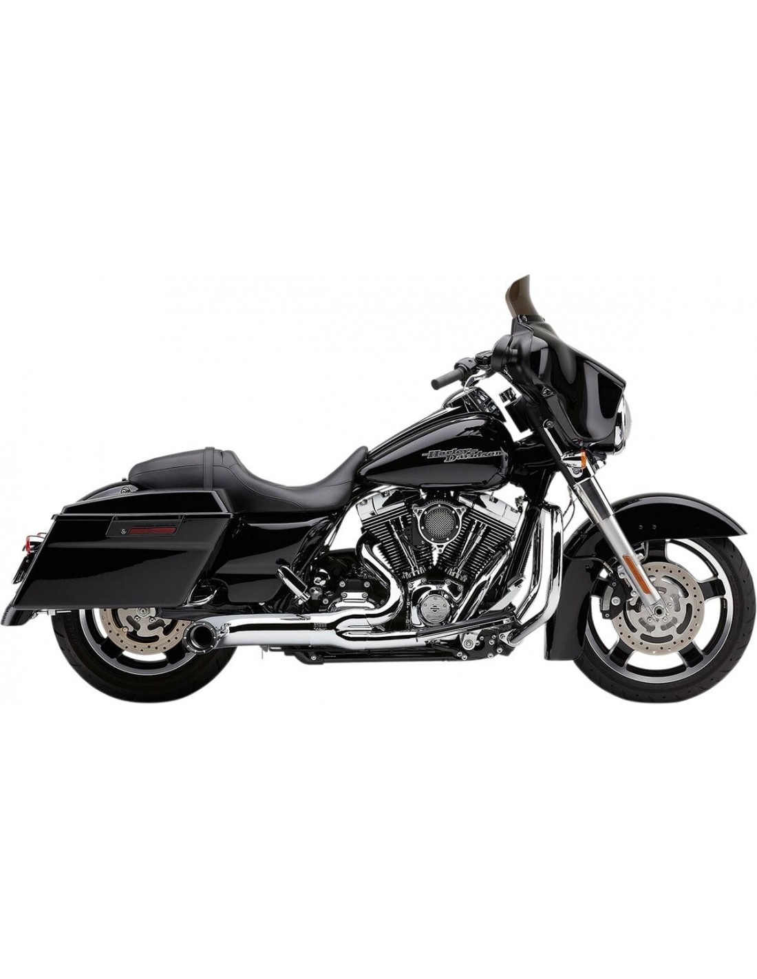 CobraRealizza un sistema di scarico 2 in 1il tubo di sterzo si fonde in un grande collettore da 2-1/4" che sale fino a un nucleo da 2-1/2" il nucleo è perforato e avvolto in una rete di acciaio inossidabile, quindi racchiuso in un cuscino in fibra di vetro corpo del silenziatore da 4" ricoperto da una punta a doppio taglio in alluminio lavorato da 4" il corpo può essere ruotato verso l'alto rispetto alla posizione di serie funziona con borse di serie o estese prodotto negli stati uniti