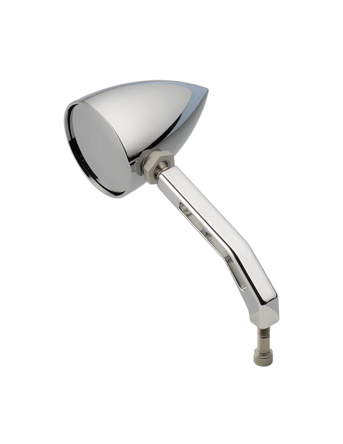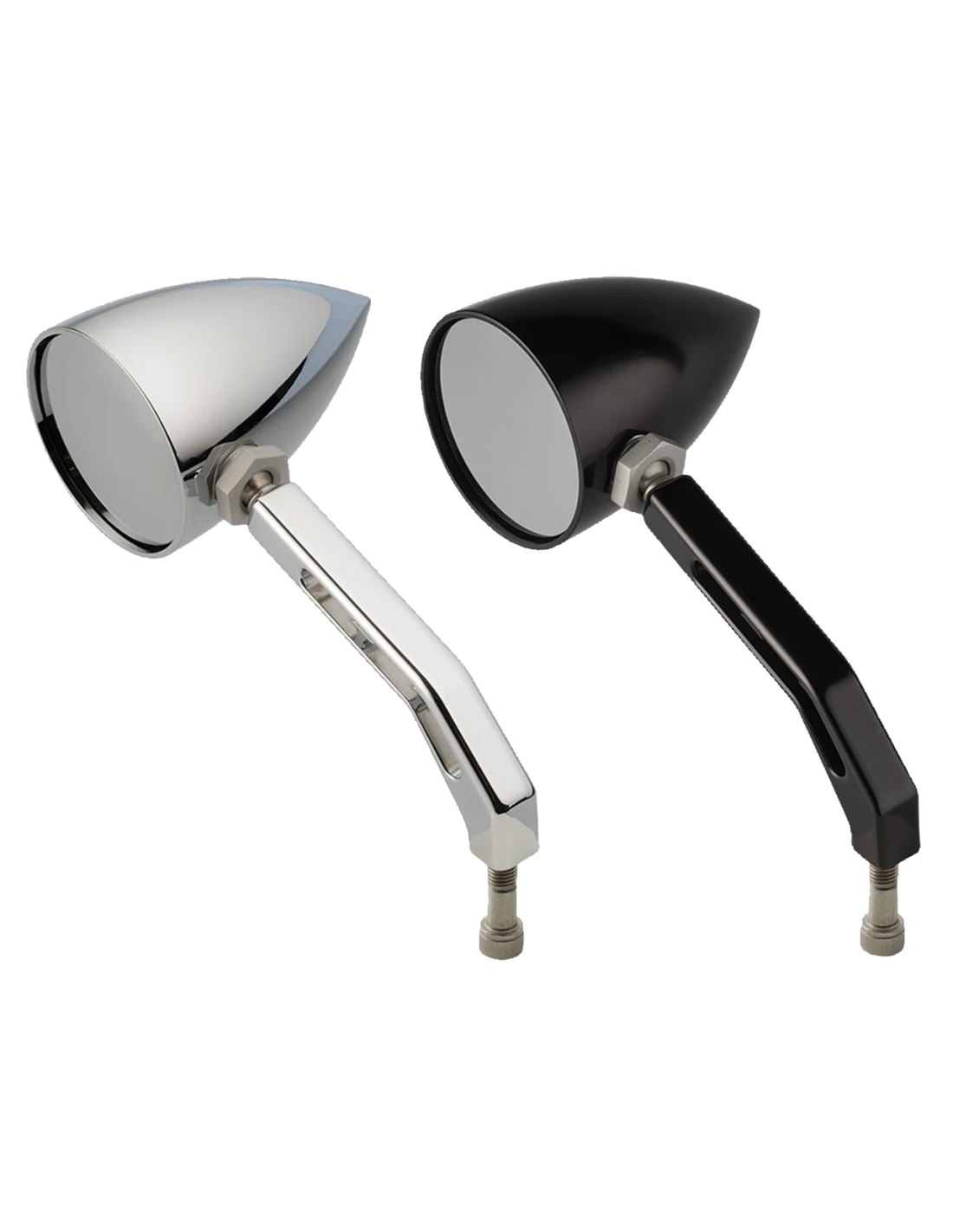 Joker MachineSpecchietti solidi, semplici e regolabili che funzionano che si installano direttamente sulle Harley-Davidson. Le teste degli specchietti possono essere bloccate in posizione o regolabili e ruotano su un giunto sferico in acciaio inossidabile esente da corrosione che garantisce un'azione super fluida e una lunga durata. Lavorati a controllo numerico in alluminio billet 6061 con finitura anodizzata nera o cromata. Gli steli sono filettati 5/16"-24 UNF, i corti sono lunghi come gli specchietti Harley di serie, i lunghi superano di 3" (7,5cm) la lunghezza di serie. L'installazione su Indian e sulla maggior parte delle altre moto metriche richiede l'acquisto separato di un adattatore per specchietti.