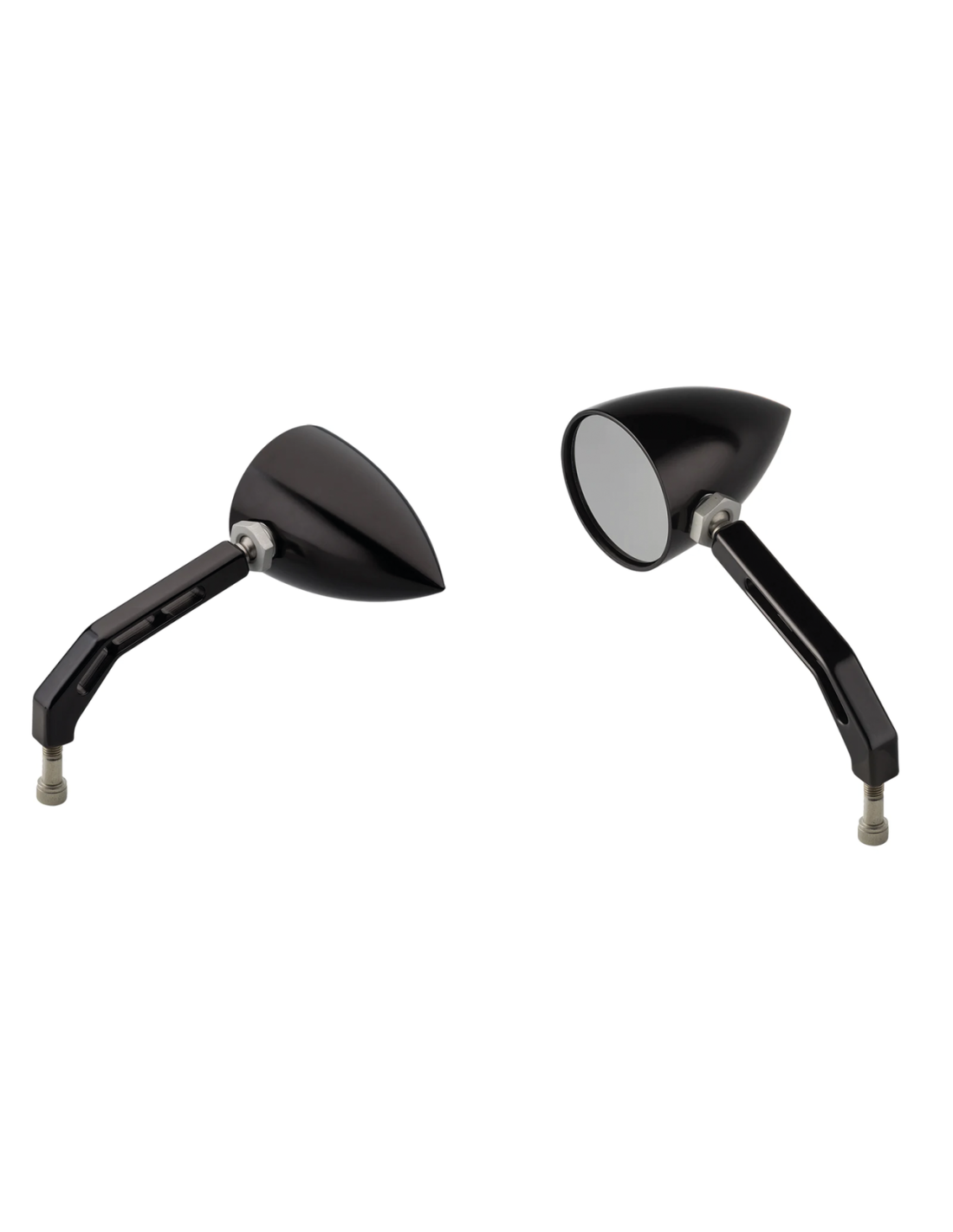 Joker MachineSpecchietti solidi, semplici e regolabili che funzionano che si installano direttamente sulle Harley-Davidson. Le teste degli specchietti possono essere bloccate in posizione o regolabili e ruotano su un giunto sferico in acciaio inossidabile esente da corrosione che garantisce un'azione super fluida e una lunga durata. Lavorati a controllo numerico in alluminio billet 6061 con finitura anodizzata nera o cromata. Gli steli sono filettati 5/16"-24 UNF, i corti sono lunghi come gli specchietti Harley di serie, i lunghi superano di 3" (7,5cm) la lunghezza di serie. L'installazione su Indian e sulla maggior parte delle altre moto metriche richiede l'acquisto separato di un adattatore per specchietti.
