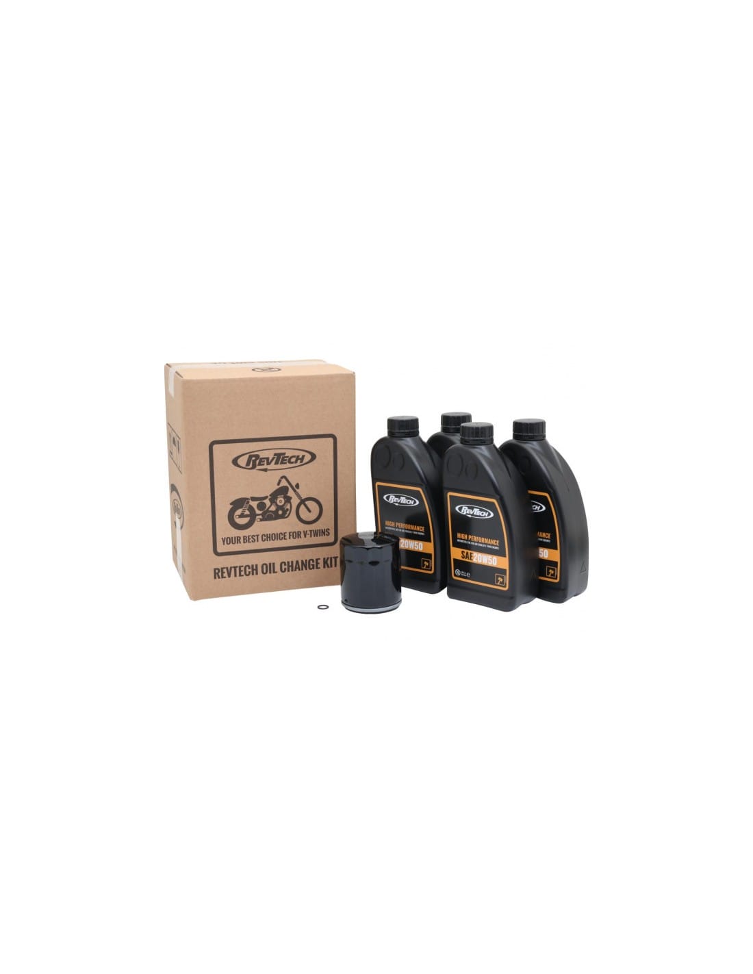 Tutto sotto un unico numero d'ordine è offerto da questi kit compilati dalla gamma di Custom Chrome. Contengono la quantità necessaria di RevTech High Performance Engine Oil SAE 20W50, un filtro dell'olio, se necessario, una guarnizione per effettuare un cambio dell'olio motore.