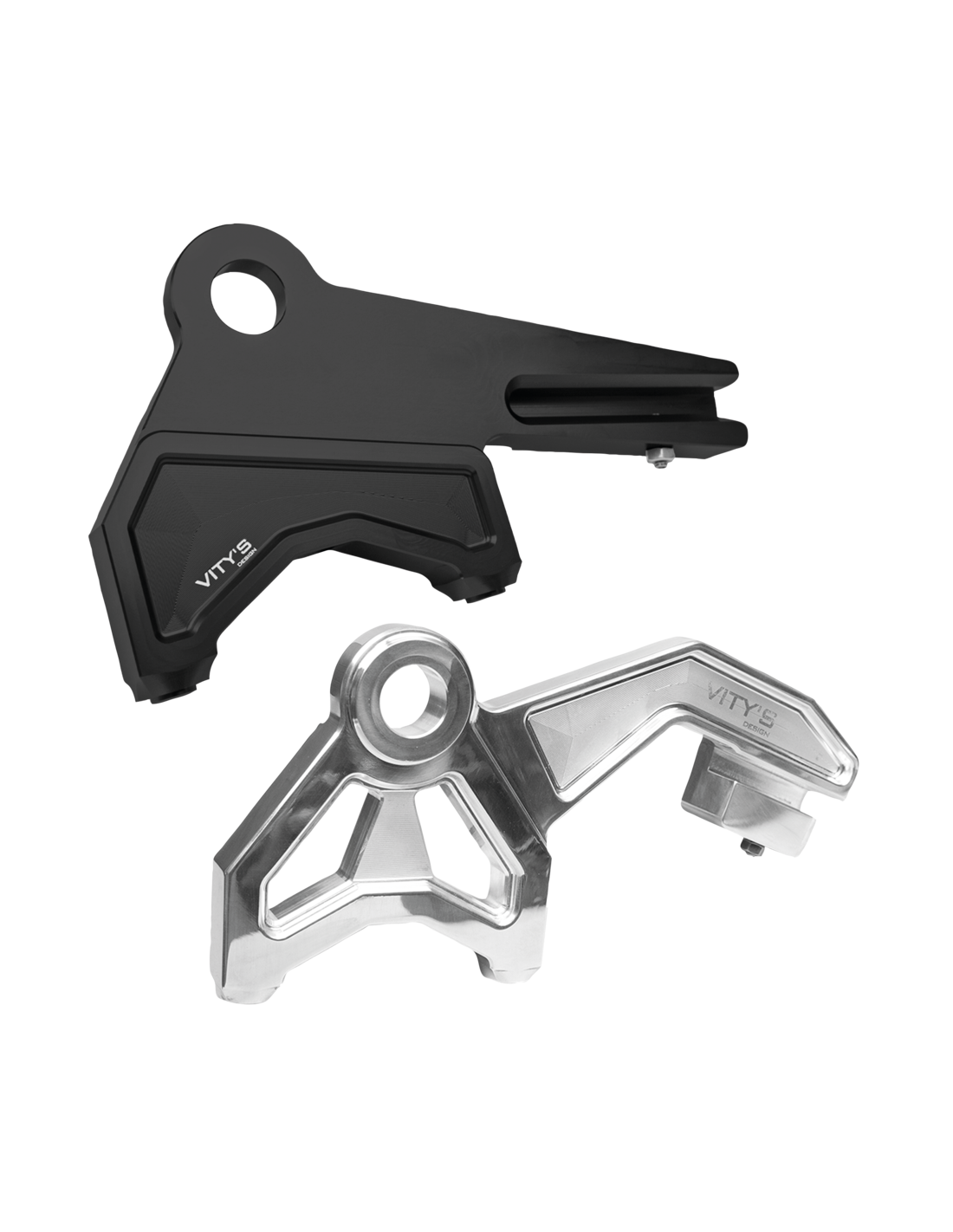 Vity's DesignQueste staffe consentono di installare pinze freno di tipo radiale su forcelloni di serie o Vity. Sono da utilizzare con pinze radiali con interasse tra i bulloni di 4 1/4" (108mm), come le nostre pinze PM Radial a 4 pistoncini. Funzionano anche con pinze di altre marche con la stessa distanza tra i bulloni. Le staffe sono lavorate a CNC da alluminio billet e sono disponibili in alluminio grezzo o con finitura anodizzata.