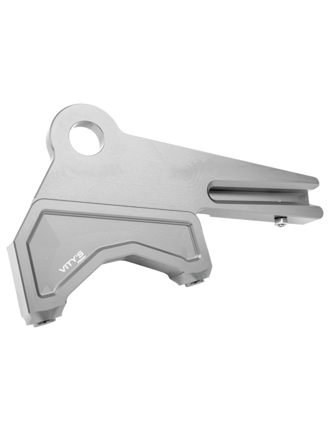 Vity's DesignQueste staffe consentono di installare pinze freno di tipo radiale su forcelloni di serie o Vity. Sono da utilizzare con pinze radiali con interasse tra i bulloni di 4 1/4" (108mm), come le nostre pinze PM Radial a 4 pistoncini. Funzionano anche con pinze di altre marche con la stessa distanza tra i bulloni. Le staffe sono lavorate a CNC da alluminio billet e sono disponibili in alluminio grezzo o con finitura anodizzata.