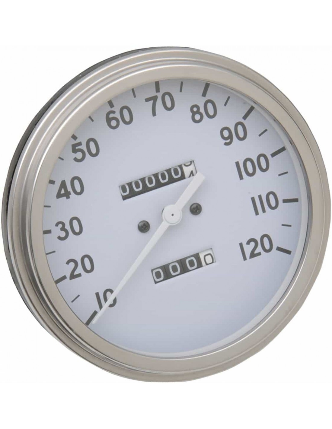 Drag SpecialtiesTachimetro 2240:60 stile FL da 5"Teste tachimetro di qualità da 5” sono disponibili in rapporto 2240:60 Presnta una filettatura di 12 mm e viene fornito fornito con una guarnizione La resa chilometrica non può essere resettata sui tachimetri. Manopola contachilometri non inclusa