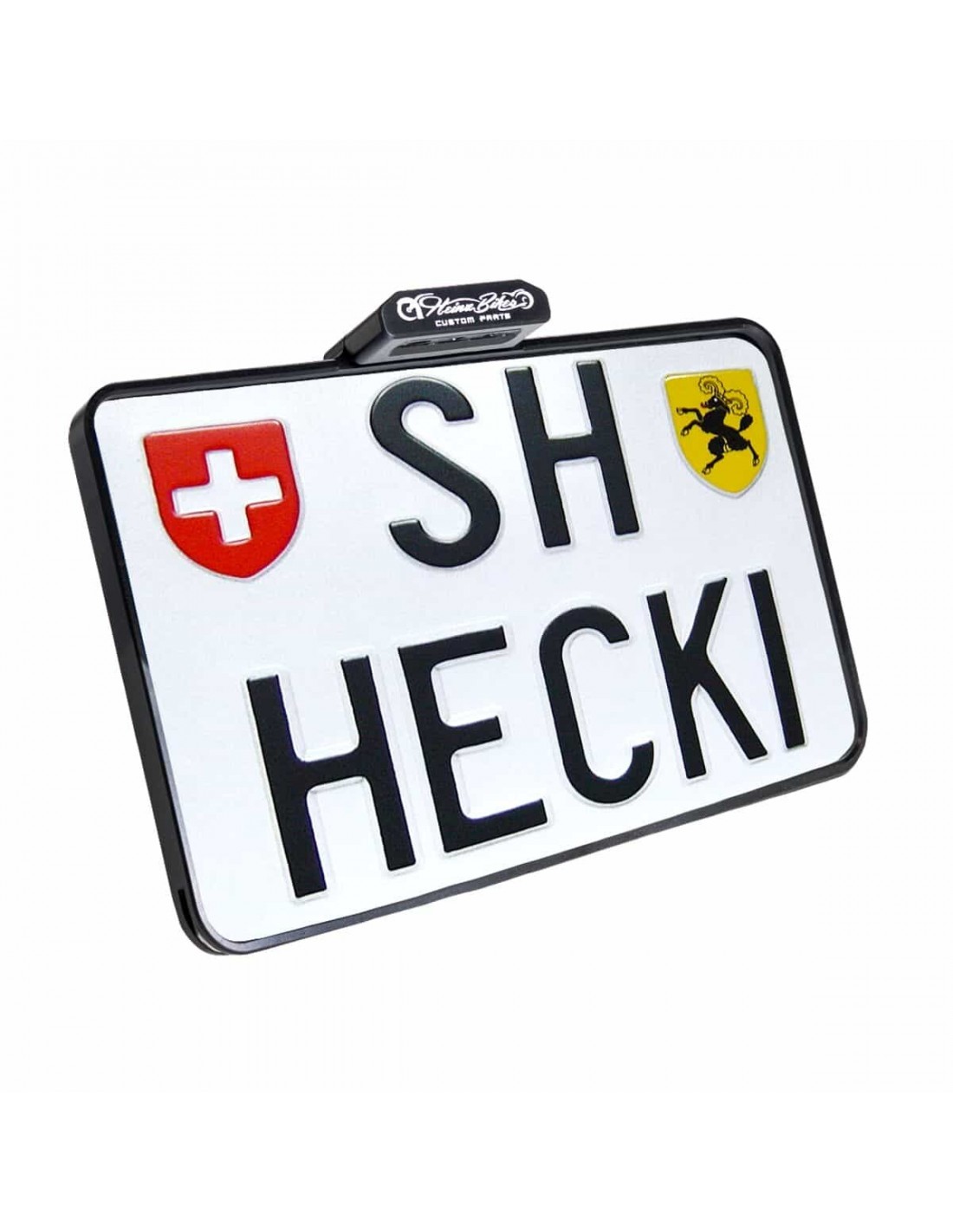 Heinz BikesAttacchi portatarga slip-inConsentono il montaggio senza viti dell'attacco portatarga con la tecnologia della cornice SLIP-IN di Heinz Bikes™ Luci indicatore di direzione a LED integrati in un'elegante carcassa in alluminio Cavi posati in modo invisibile all'interno In alluminio di alta qualità lavorato a CNC Braccio stabile con tecnologia antitorsione sicura e garantita sul forcellone Disponibili con finitura nera anodizzata o cromata Include tutto il materiale per il montaggio ei dadi perno ruota Dimensioni targa (Svizzera): 180 mm LARG x 140 mm ALT