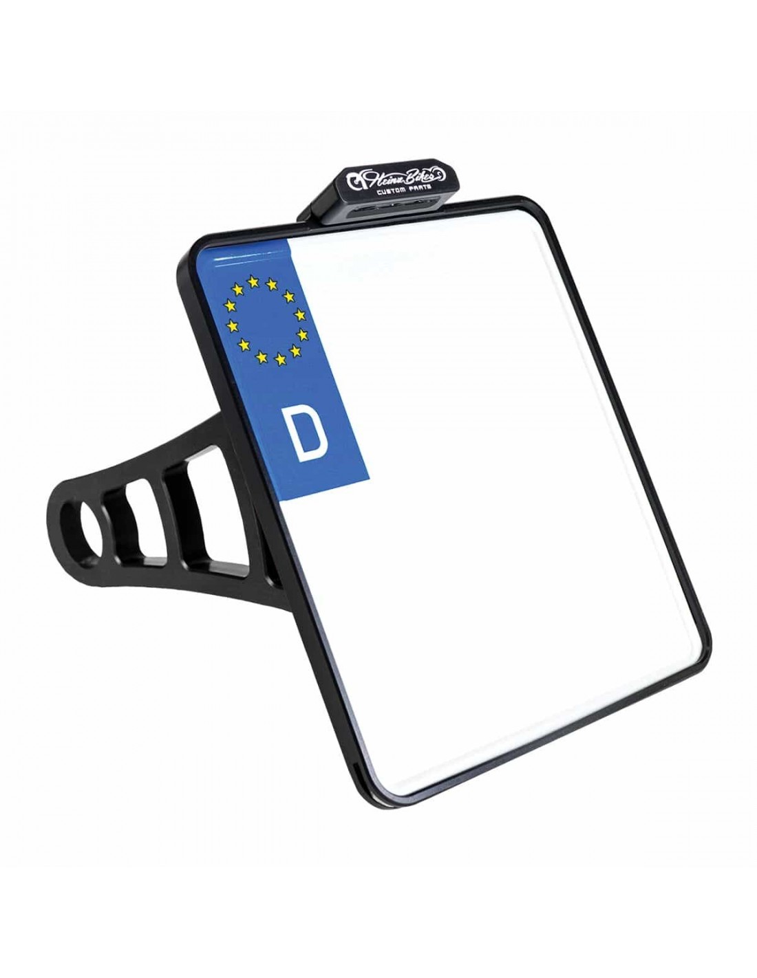 Heinz BikesAttacchi laterali per cornice portatargaConsentono il montaggio senza viti dell'attacco portatarga con la tecnologia della cornice SLIP-IN di Heinz Bikes™ Luci indicatore di direzione a LED integrati in un'elegante carcassa in alluminio Cavi posati in modo invisibile all'interno In alluminio di alta qualità lavorato a CNC Braccio stabile con tecnologia antitorsione sicura e garantita sul forcellone Include tutto il materiale per il montaggio e dadi asse Dimensioni targa Germania Plus 220 mm L x 200 mm A (versione cromata)