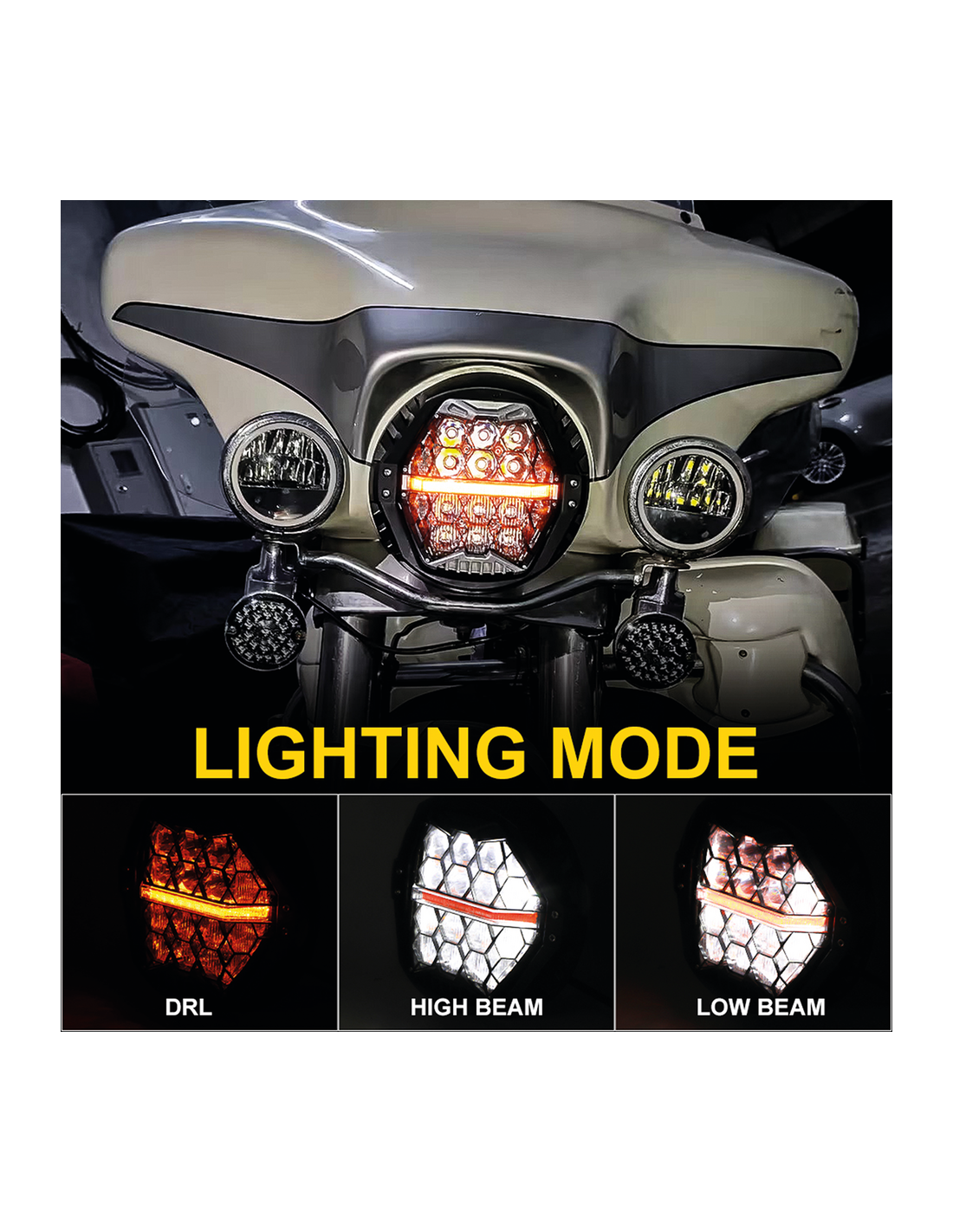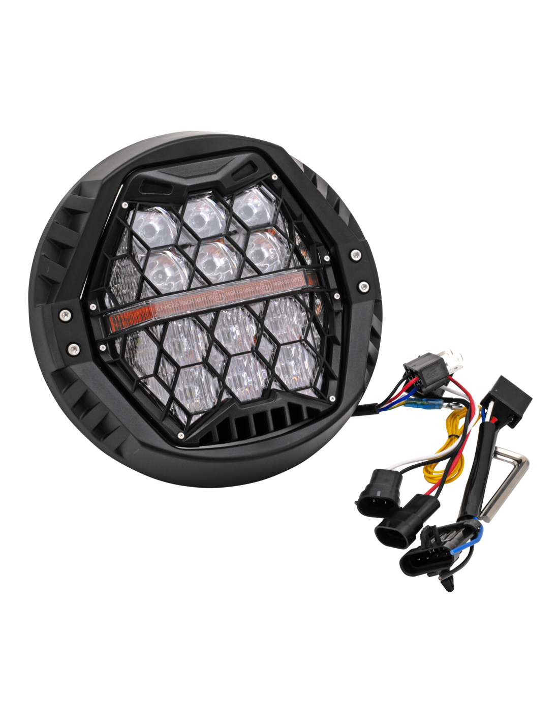 Questa parabola a LED omologata E è dotata di abbaglianti e anabbaglianti e di una funzione DRL (Luce di Marcia Diurna). Presenta una barra ambra illuminata orizzontalmente per uso da show. Si adatta alla maggior parte dei fari da 7", ma può essere installato anche senza alloggiamento. L'unità si adatta agli alloggiamenti con una profondità minima di 70mm e dispone di un connettore H4 standard a 3 poli. Viene fornito completo di un cavo adattatore in stile H13.