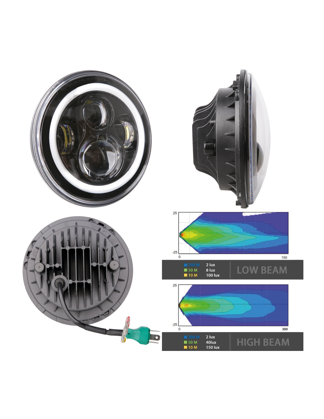 Questa unità di fari a LED omologata E è dotata di abbaglianti e anabbaglianti e di un anello Halo che può essere utilizzato come luce di marcia diurna (DRL), luce urbana o luce di parcheggio. Si adatta alla maggior parte degli alloggiamenti dei fari da 7" e dispone di un connettore H4 standard a 3 poli. L'installazione su modelli dotati di CAN-Bus richiede l'acquisto separato dell'adattatore ZPN 745493.